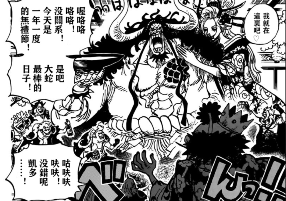 “凌空六子”已经四散而去,都去办理凯多交代的任务,也就是找到大和。只有黑玛利亚留在凯多的身边陪酒,看来她对“大看板”的位置并不感兴趣。