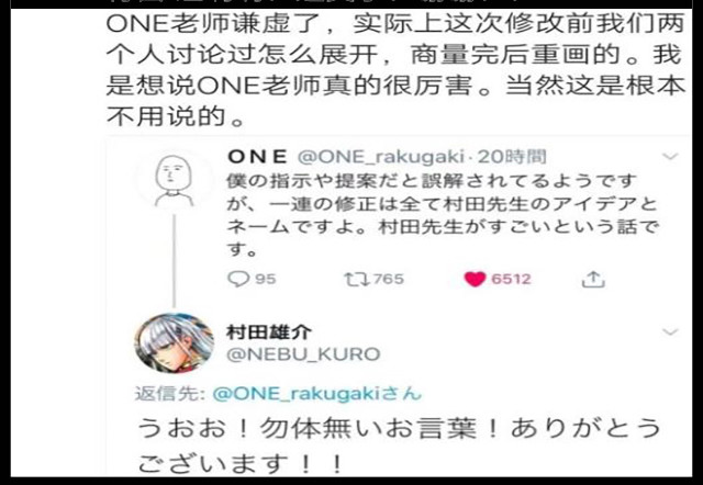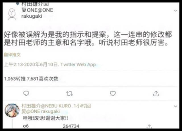 One在推特的大概意思是:村田其实误解了我的指示和提案,(大部分剧情修改)这些都是村田自己的意思,听说村田很厉害。