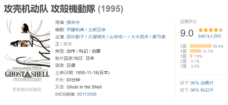 再加上后来引入了对自我意识的迷思,以及人工智能生命所抱有的天下大同的普世性观念,这部日漫也被无数动漫迷视作为科幻动漫的巅峰,并助推押井守登上了动漫创作的神坛---