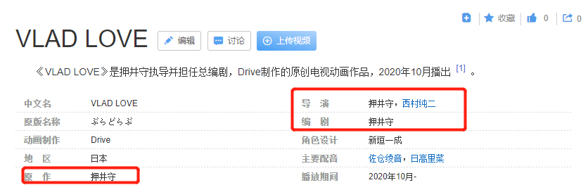 这部作品名为《VLAD LOVE》,而就在制作名单上方我们便清晰看到了押井守的名号(原作、导演、编剧等重量级职位全有涉及)。