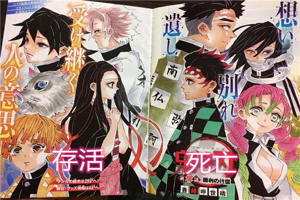 200话的封面图一共出现了九个角色,分为左右两页呈现。左边从上到下依次是水柱、风柱、伊之助、祢豆子以及我妻善逸。右边从上到下依次是岩柱、蛇柱、炭治郎和恋柱。这个站位刚好印证了最新话的情报内容,左边生,右边死。