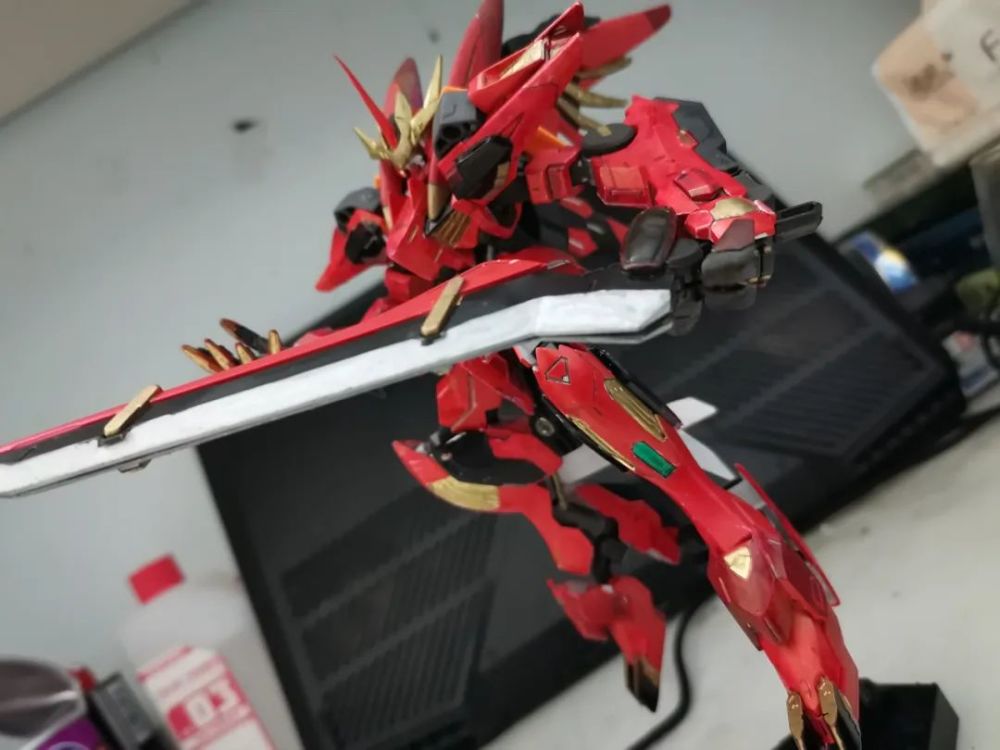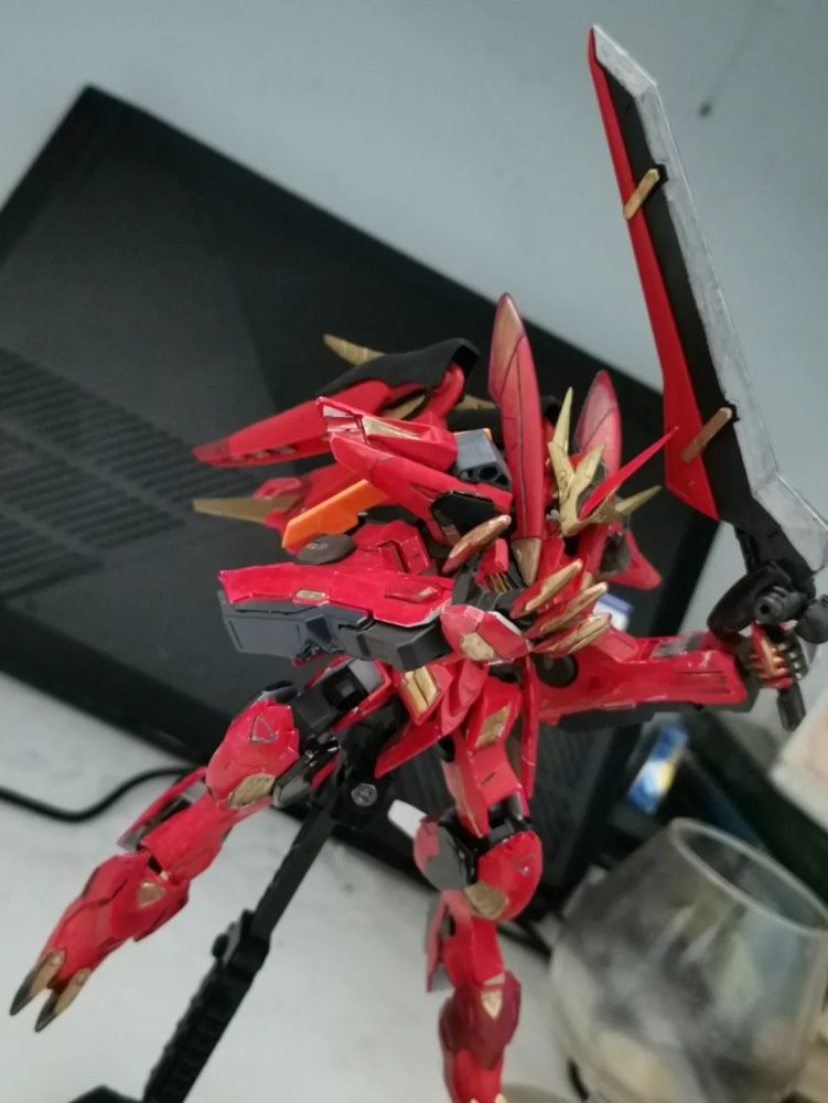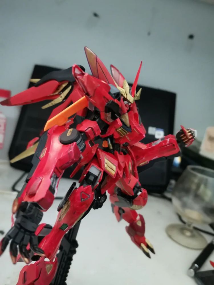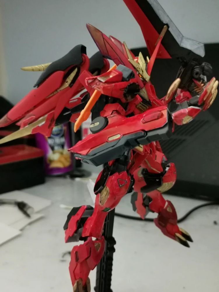 由于小区封闭规定,到今天为止在家隔离一个来月了,就尝试了一下魔改,算是我第一次接触魔改和上色。机体的命名为巴巴托斯 红龙,用了四个模型,万代巴巴托斯,高高的命运和主天使,座天使二型。由于还没买到,全程笔涂,也算试水,但效果不太好。虽说现在随着公众号教程的一次次发布,喷漆已经略有提升,——至少补土和基本动作已经会用了,但只会用预调漆——但那个时候还真是对上色技术一窍不通。没打补土,剐蹭掉色严重,后期反复补色留下了明显笔触,而金色更是存在氧化,以及高高留缝明显。不过还是希望能让大佬看看自己的魔改造型设计,表扬也好,批评也好,希望能得到评价,模型也是艺术,得到评价大概是每个做艺术作品的人的渴望吧!不知道能不能进新手村呢。最后感慨一下,歪门邪道,果然P图才是模型制作的终极技能……(最近P图随便玩玩,作法和前两天教程上讲的“视觉骗术”不谋而合)下面是模型作品和P图