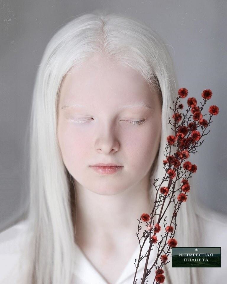 因为先天性的白化病,她的全身的毛发都变成了白色的,你一眼看上去,她的头发、眉毛以及睫毛都是像雪一样洁白的颜色,如果不是告诉你这是先天的,可能你会觉得她在cosplay哪一位动漫角色。