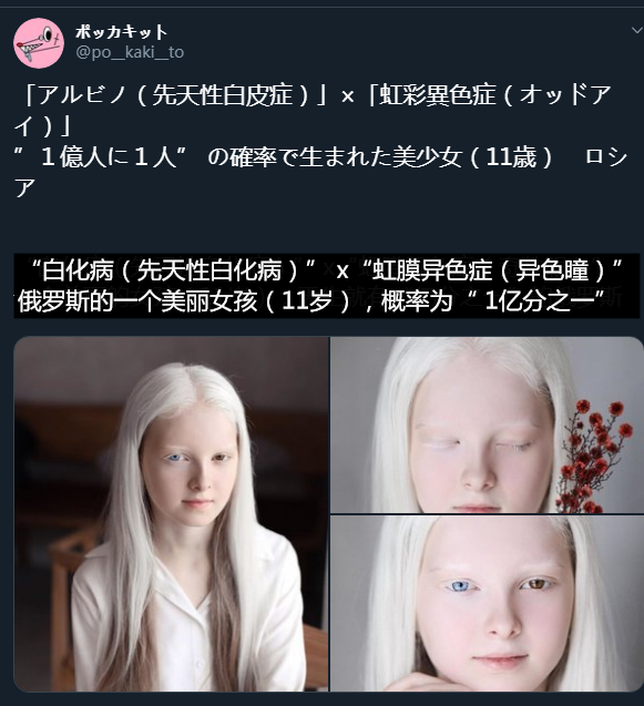 最近一位美丽的俄罗斯女孩在社交网站上刷屏了,11岁的她天生患有虹膜异色症和先天性白化病,这两种病都非常罕见,而被两者加于一身的概率仅仅有亿分之一,这还只是理论上的数字,可能全世界只有一位这样的天使而已。