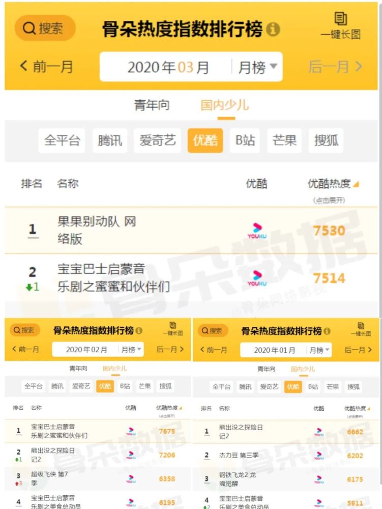 据骨朵热度指数排行榜数据统计可见,2020年第一季度,优酷少儿动画的月榜榜首,分别有三部作品登顶,其中1月份是《熊出没之探险日记2》,2月份是《宝宝巴士启蒙音乐剧之蜜蜜和伙伴们》,3月份是《果果别动队》。
