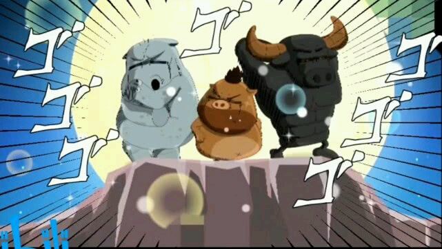 还有两次JOJO立的场面,第一次是美羊羊误把一个头上长草的羊当成了村长,结果这只羊直接摆出了二乔最经典的捂脸JOJO立;第二次出现的JOJO立是自带音效的,爱干净的三人组,河马、野猪和犀牛对着细菌大王摆出了月下三兄贵的经典姿势,阿姨压一压!
