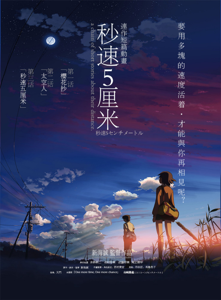 《秒速5厘米》是新海诚创作的一部写实动画,于2007年3月3日在日本正式上映。