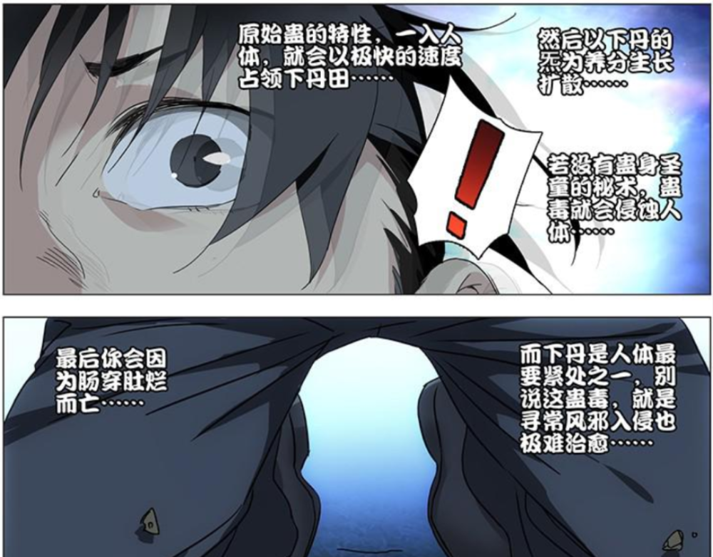 原始蛊进入人体之后,会极速的占领下丹田,如果没有陈朵的秘术,蛊毒就会以下丹田的炁为养分生长扩散,最后让人穿肠烂肚而死。丹噬是唐门绝学,但在这个世界中,蛊身圣童是唯一的,在漫画中一旦中了原始蛊的人也是必死无疑。