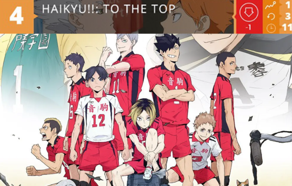 这次排在第四的是《排球少年陆VS空》,没想到小排球的排名竟然这么高,坦白说这部一月番老白一直没去看,可能没打过排球吧,对此兴趣不浓,如果是篮球或网球/羽毛球的话,老白认为应该会去看看,毕竟贴近自己生活,也许能从里面学到有意思的技能呢,当初的羽毛球技能就是从《网球王子》里学到的。