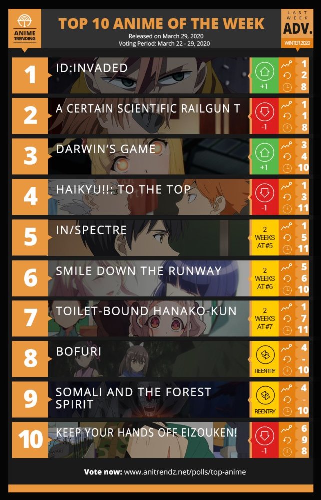 2020年一月新番陆续完结,相信大家这一季度都有自己喜欢的动画吧,最近动画主题网站Anitrendz根据网友投票选出了这个季度完结时的10部最佳动画,其中《异度侵入》在最后一周强势上涨获得榜首,下面对榜上动画做个简单的介绍,如果有哪部你感兴趣的不妨去补一
