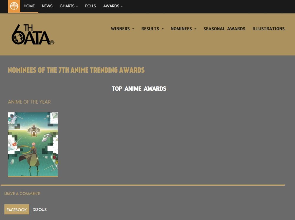 《异度侵入》在获得榜首的同时也被提名为了2020年度动画候选,Anitrendz评选的年度动画去年是《冰海战记》,前年是《比宇宙更远的地方》,整体更倾向于能给人留下长久的感动的动画,《异度侵入》各方面都符合评选的标准,如果之后的动画没有做到更完美的话,那么今年的最佳可能就是它了。