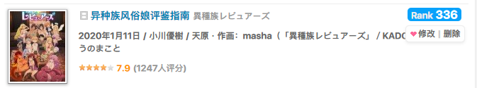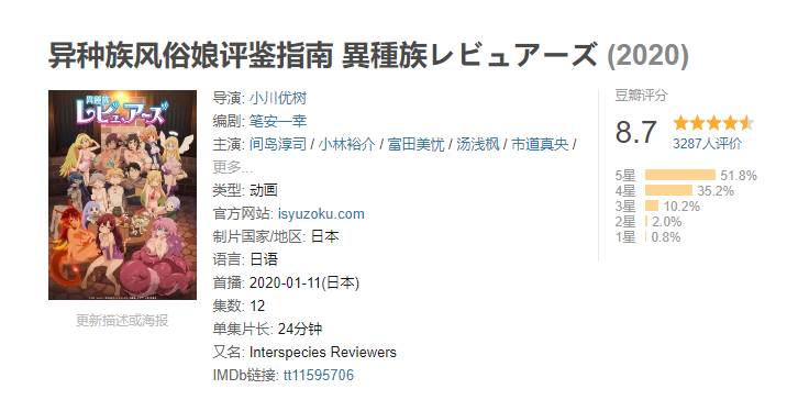 虽然只是特例,但这部动画让女生都能以轻松的心态观看,还不觉得过于反感,也从侧面证明了《异种族风俗娘》的成功并没有那么简单。事实上在豆瓣和bangumi等评分网站,它也分别得到了了8.7和7.9的高分。